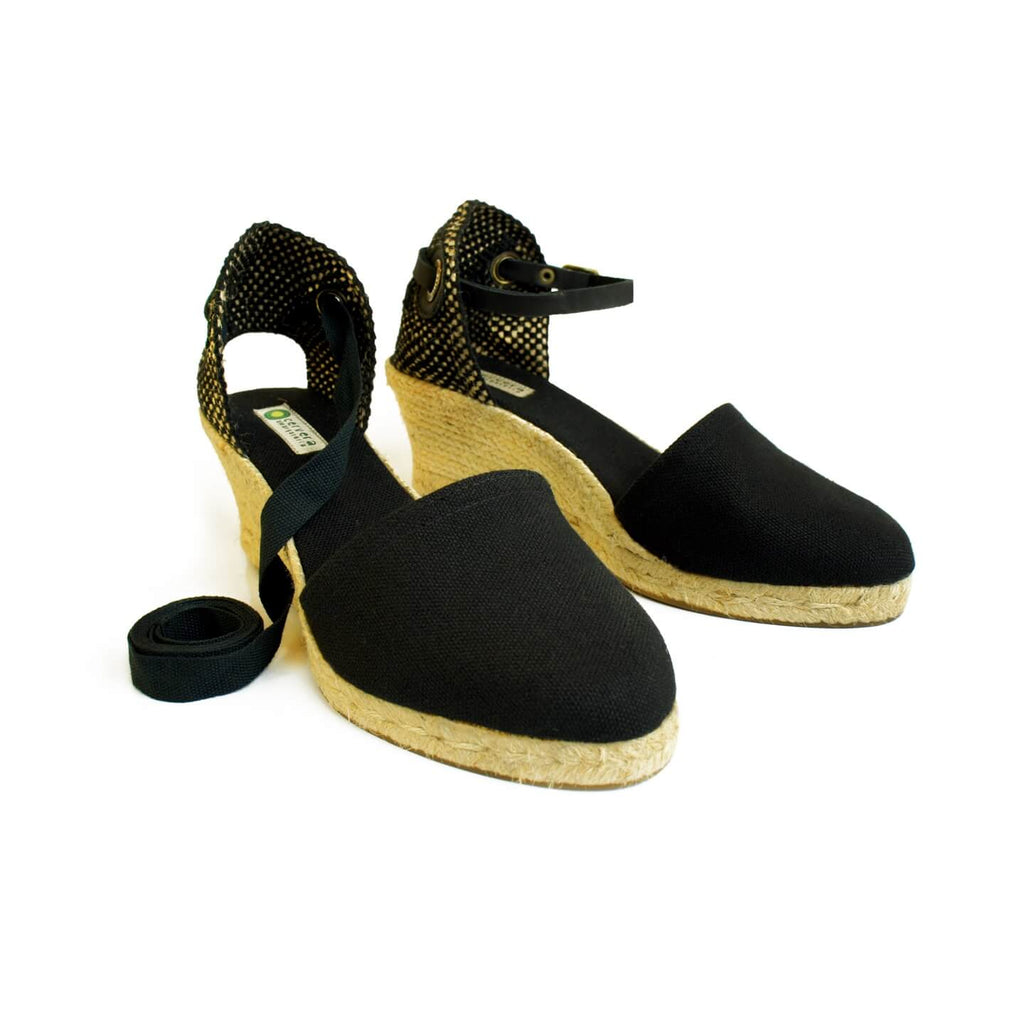 A sandália anabela Madalena é um exemplo de elegância e conforto. Feita de lona e com forro 100% algodão, ela possui calcanheira de tear de juta e algodão, fechamento duplo de fita de algodão e pulseira de couro. Sua palmilha é revestida com lona de algodão, e o solado é confeccionado em juta com borracha vulcanizada.
